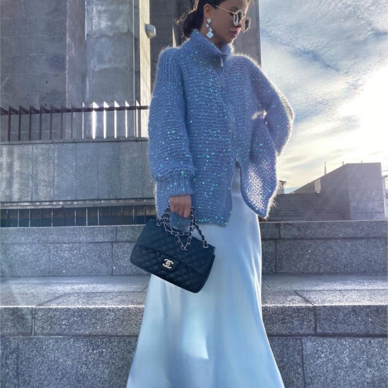 This elegant sequin sweater is designed with fashion in mind. Features include long sleeve, loose fit and a zipper closure. Crafted with a lurex fabric, this cardigan is perfect for autumn streetwear. Get the look with this flattering and fashionable piece.