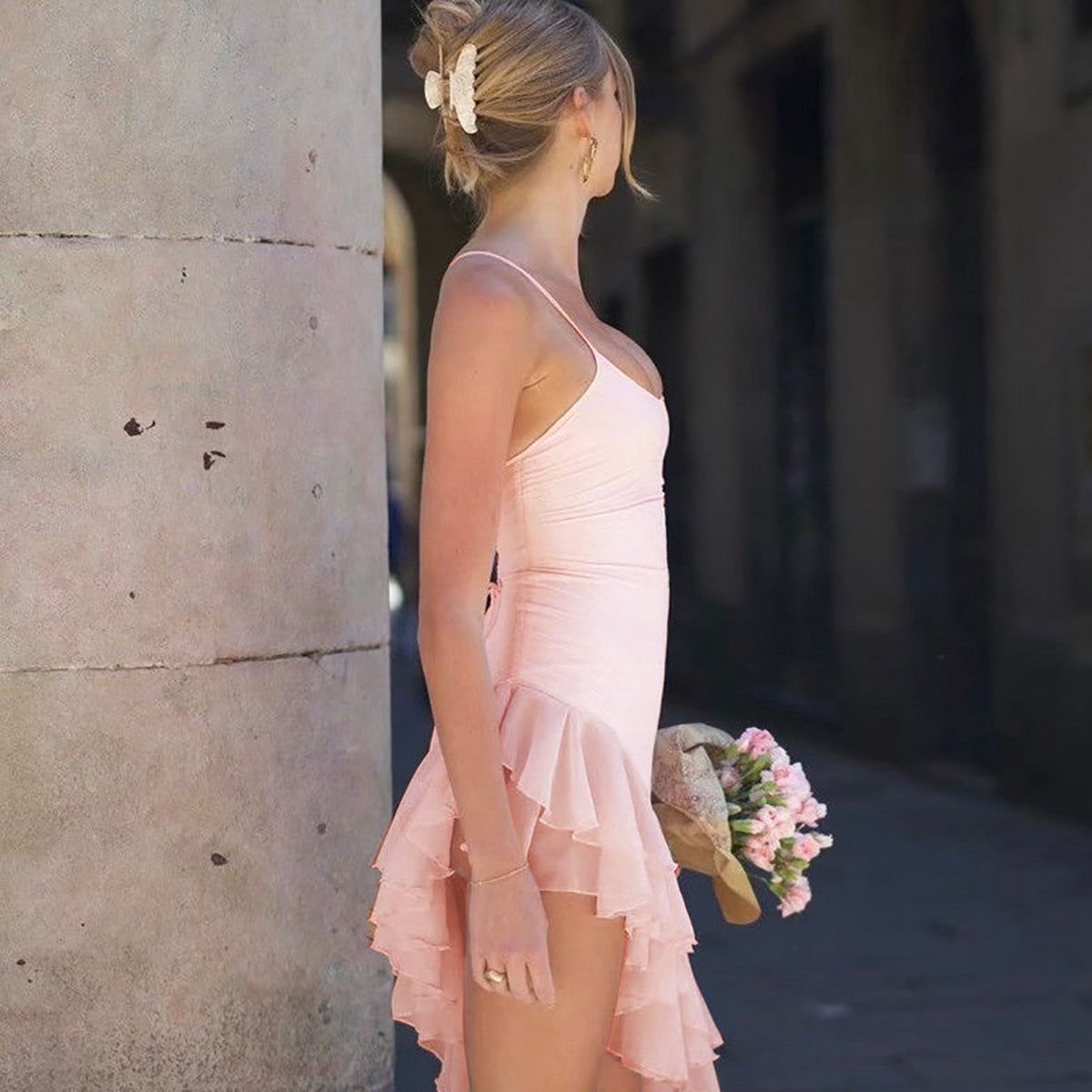 This ruffled halter dress features a slim, backless design with spaghetti straps and patchwork detailing, perfect for summer style. Made with lightweight, breathable fabric, this dress is both fashion-forward and comfortable. Step out in confidence and style with this sexy mini dress.