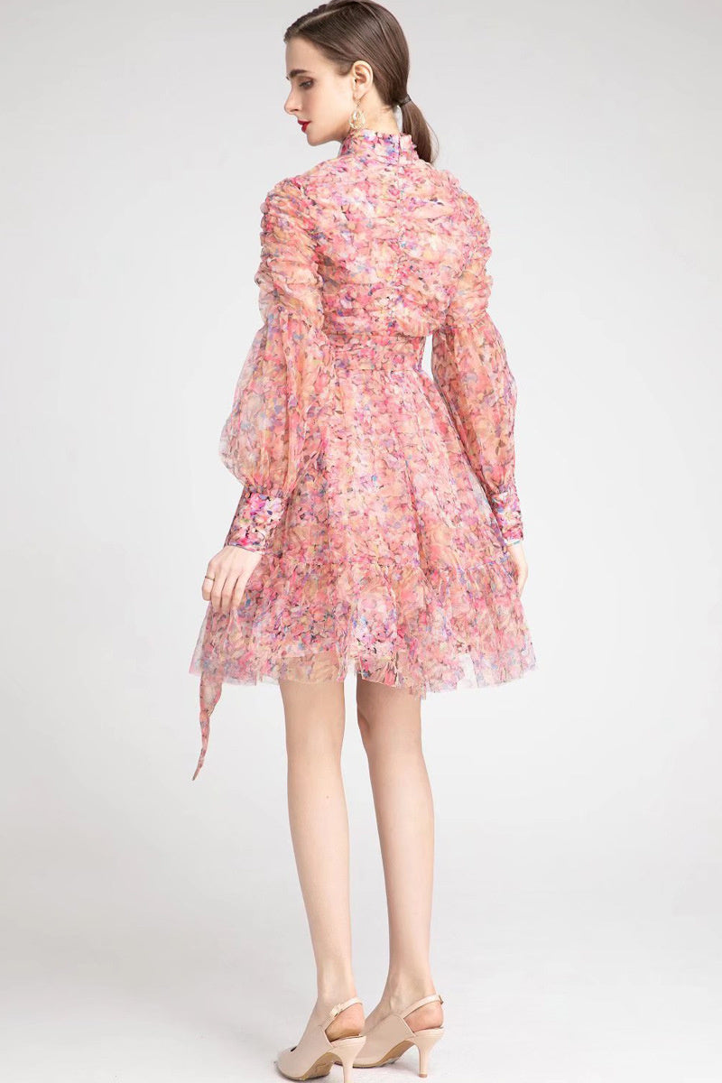 Introducing the Bonnie Neck Lantern Sleeve dress from Spring-Summer 2023. This elegant dress features a standing neckline, classic lantern sleeves, and a pleated waist with a lace up closure to accentuate your shape. Its beautiful print adds a subtle touch of style, making this dress a perfect addition to your wardrobe.