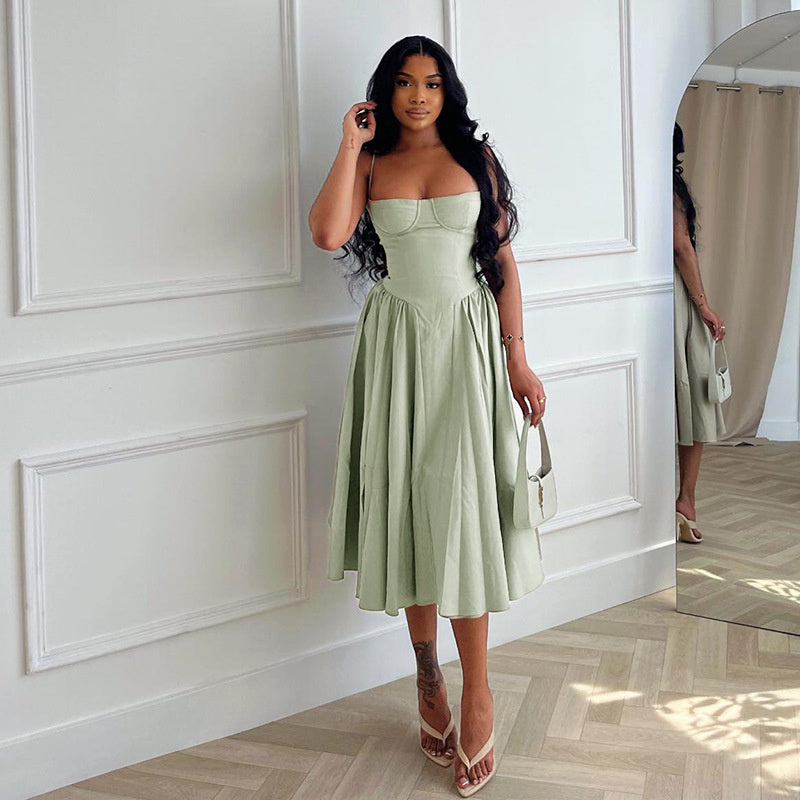 Look stylishly chic in this Caroline A-Line Midi Dress. This elegant dress features a figure-flattering A-Line silhouette, spaghetti straps, a backless design, and a loose fit for added comfort. Composed of a lightweight material, this dress provides a unique and fashionable look that is both comfortable and stylish.