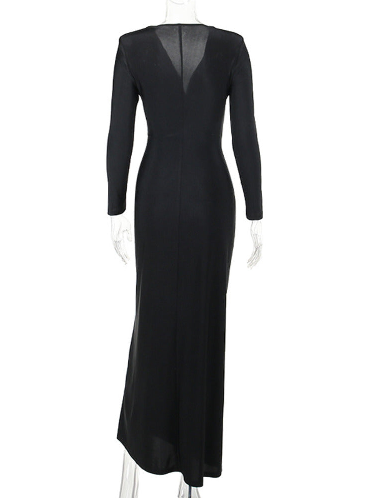 Elevate your style with our Elegant Deep V Neck Maxi Dress. Featuring a stunning thigh high split, this dress exudes sophistication and seduction. The long sleeves and black pearl decoration add a touch of elegance to this fashion-forward bodycon dress. Perfect for any occasion, it's a must-have for every woman's wardrobe.