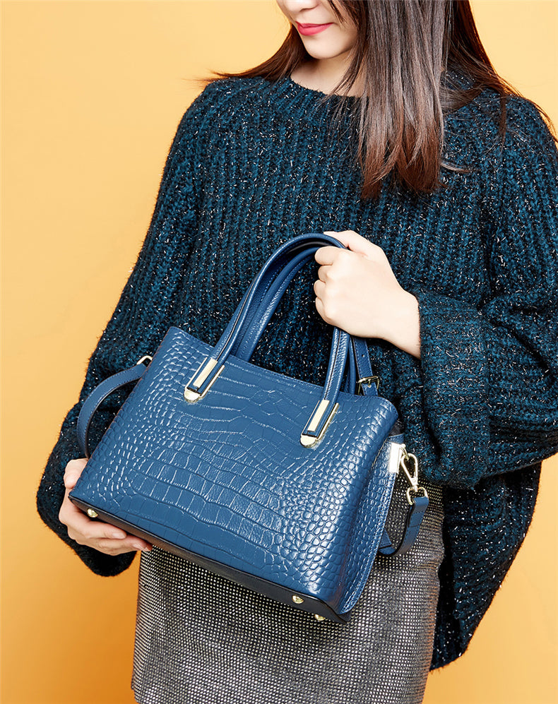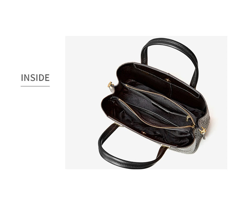 This 100% genuine leather tote handbag offers both style and practicality for women on the go. Its trendy crocodile print and designer label make it a must-have accessory for any fashion-forward professional. With its spacious interior and convenient shoulder and crossbody straps, this bag is perfect for the office and beyond.