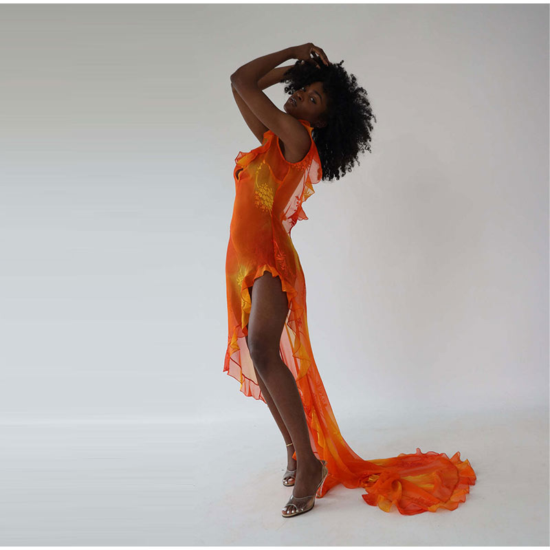 This Gina Mesh Printed Hollow Out Maxi Dress shows off your style with a flattering mesh sheer tie-dyed print, hollow-out detail, and a ruffled trailing maxi skirt. It features a sexy backless high split design for a summery, feminine look. Perfect for special occasions or everyday wear.