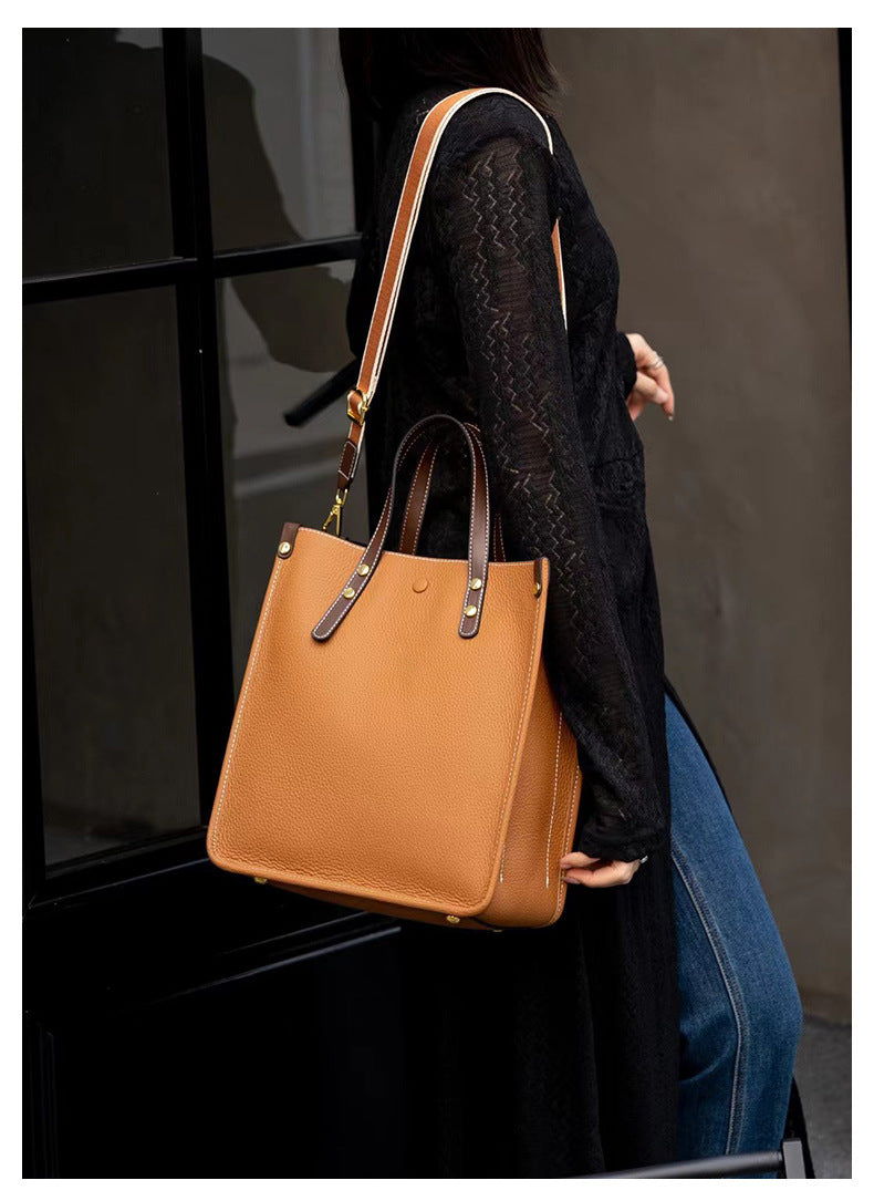 This vertical tote handbag is made with 3 layers of genuine leather, ensuring quality and durability. Perfect for professionals, it offers a spacious interior and various carrying options for all-day utility. Elevate your style and confidence with this trend designer work bag.