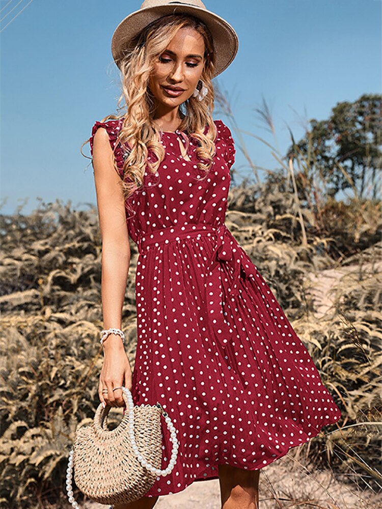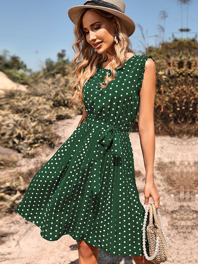 The Pamela Summer Polka Dot Midi Dress is perfect for warm weather days. Crafted with lightweight fabric, this A-line dress features a playful, summery print with short sleeves and button detailing. The pleated skirt and figure-hugging silhouette makes it ideal for beach days or casual summer parties.