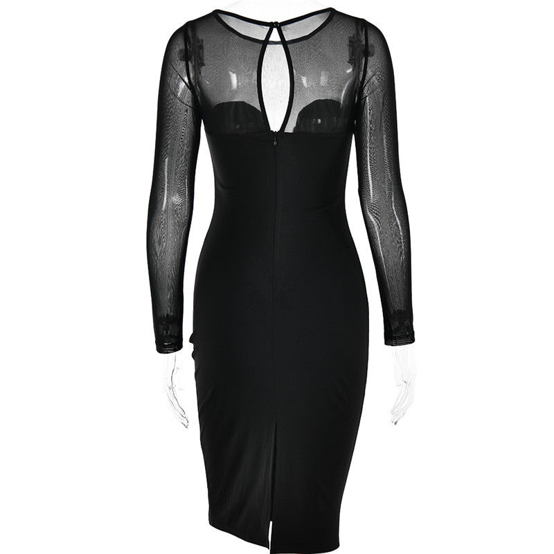 Experience elegance and sexiness with our Strapless Midi Dress. Featuring sheer long sleeves, a backless design, and a flattering bodycon fit, this dress is perfect for any club party. The split detail adds a touch of sophistication while keeping you comfortable and confident. Elevate your wardrobe with this fashion-forward piece.