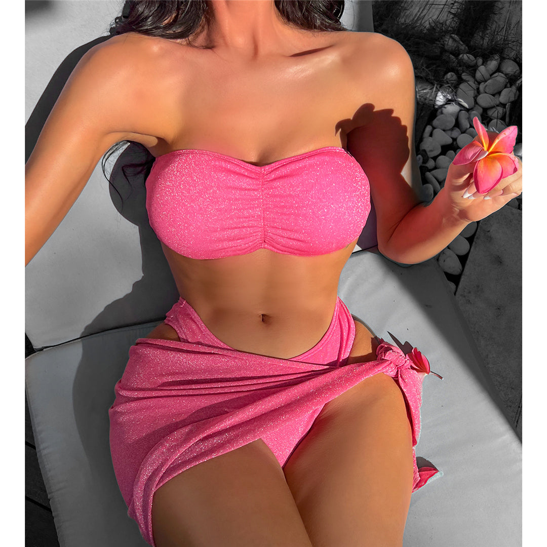 Introducing our Shiny Bandeau With Sarong Brazilian Bikini set, the perfect swimwear for women. With its stylish design and comfortable fit, this swimsuit is perfect for any beach or pool day. Made with quality materials, it provides both style and functionality. Make a statement with our Shiny Bandeau With Sarong Brazilian Bikini set.